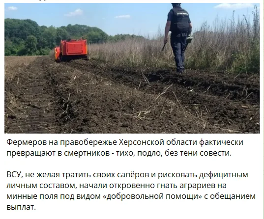 “Farmers on the right bank of the Kherson region are effectively being turned into suicide victims — quietly, cowardly, without a shadow of conscience. The AFU, unwilling to expend their sappers and risk scarce personnel, have begun openly driving farmers onto minefields under the guise of ‘voluntary assistance’ with a promise of payments,” — say the Russians.