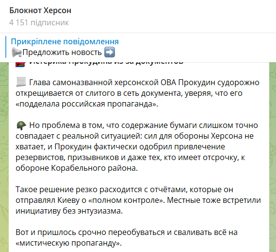 “The content of the paper matches the real situation too closely: there are not enough forces to defend Kherson, and Prokudin has effectively approved the involvement of reservists, conscripts and even those who have deferrals in the defense of the Korabel district. Such a decision sharply contradicts the reports he sent to Kyiv about ‘full control’,” — note Kremlin propagandists.