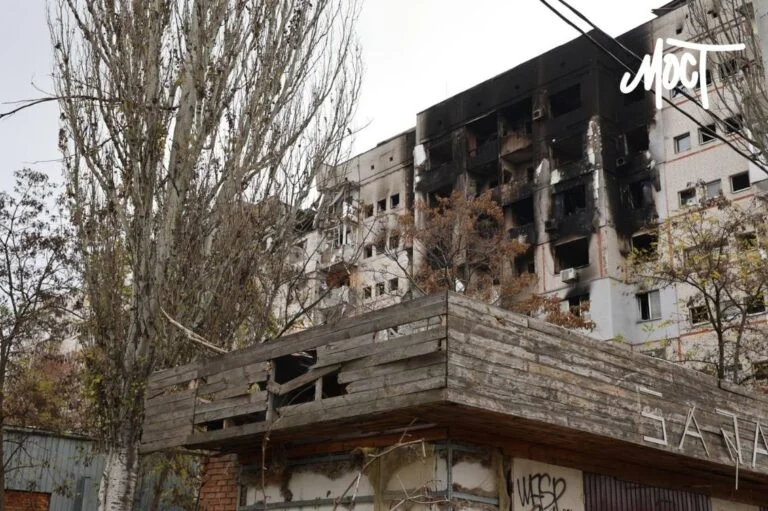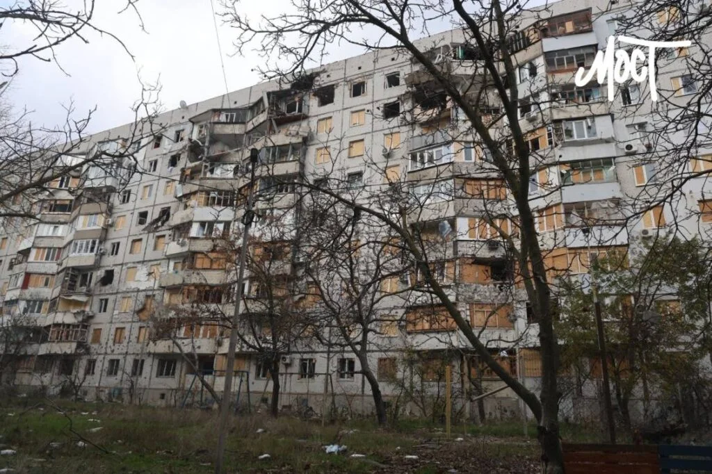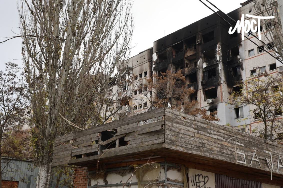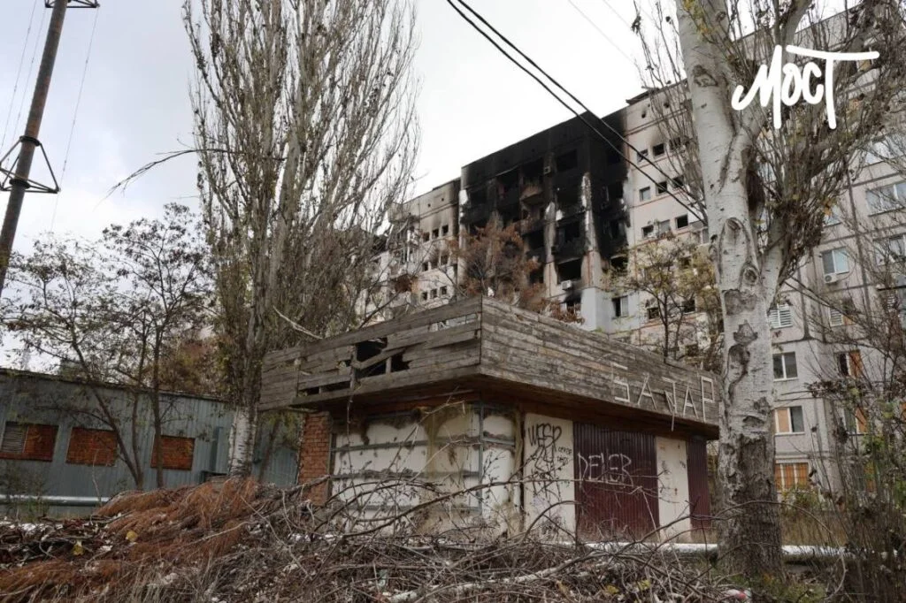 Some apartments burned out completely — the facades are blackened by fires. Windows in many homes are blown out or boarded up with plywood, and balconies and exterior walls are also destroyed.