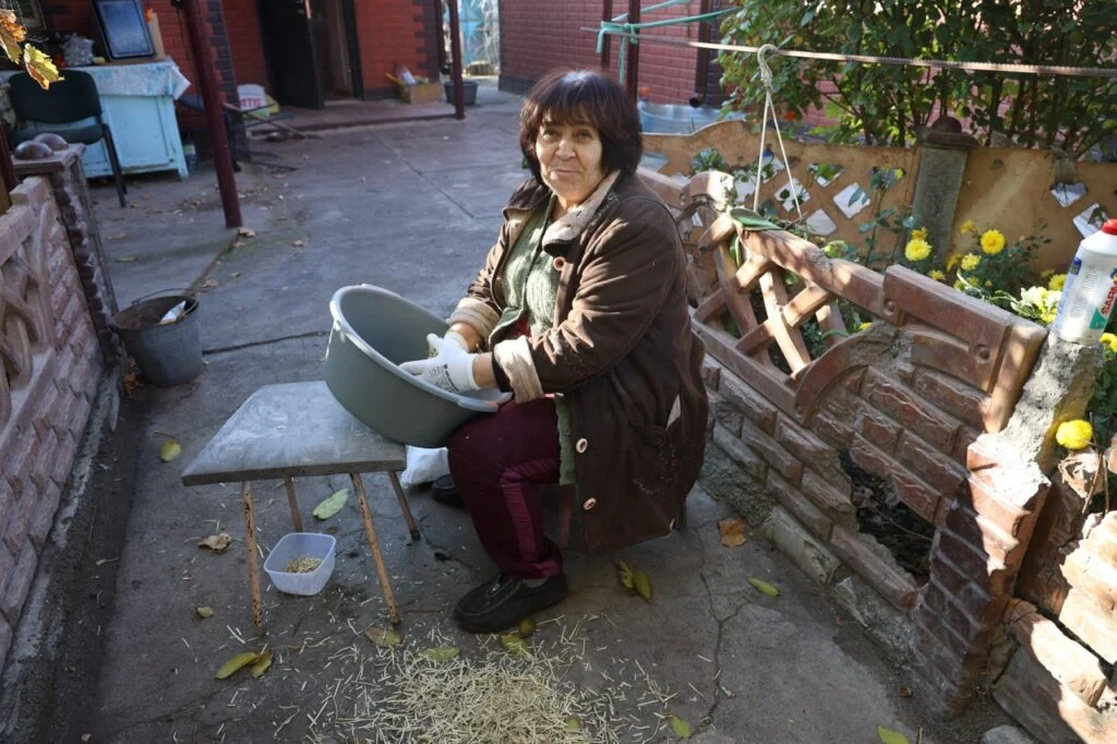 She sits on a stool and is threshing some seeds from unusual ears. She says these are flower seeds that she will sow in the flower bed in spring.