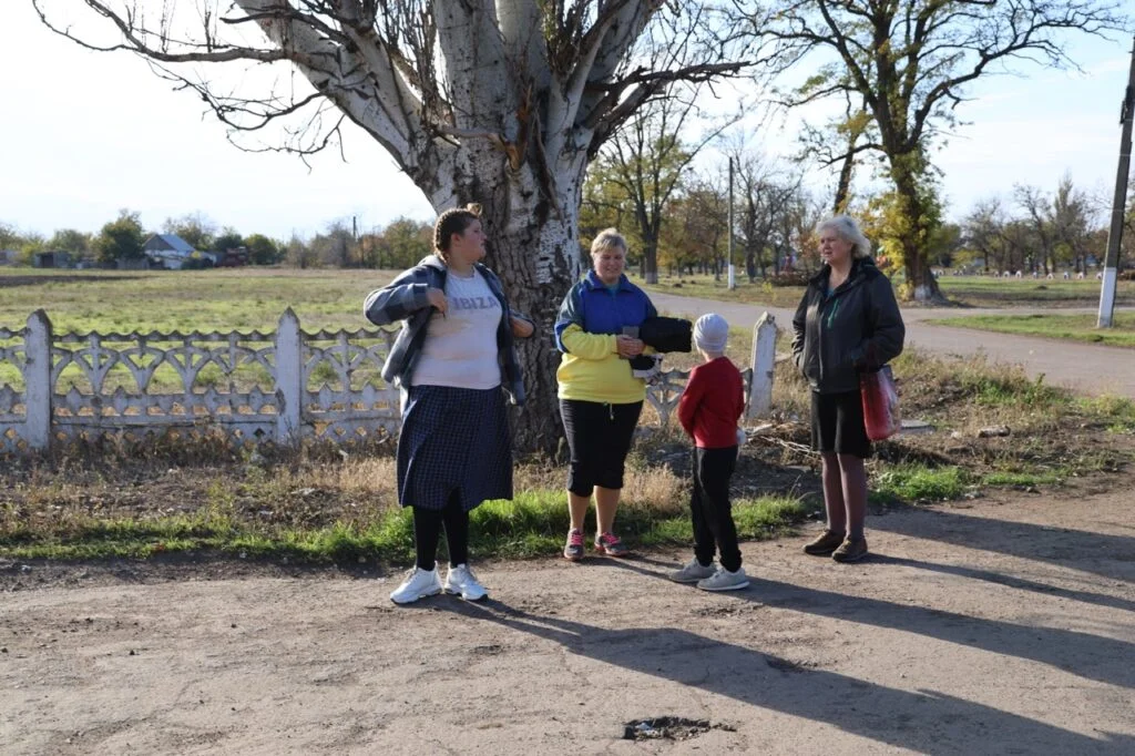 Nearby is a small trailer that serves as both a medical post and the elder’s office. Beside the trailer, skillfully sweeping with a broom, a woman is clearing the autumn fallen leaves. As it turns out – this is the elder of Novovoznesenske, Valentyna Chernenko. We had planned to go with her and finally film a report from the former Potomkyne, which has now become Nezlamne. These villages belong to the same eldership.