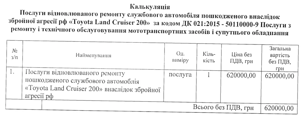 As stated on the Prozorro portal, on November 4 the regional prosecutor’s office signed a contract to repair the official Toyota Land Cruiser 200, which was damaged as a result of the Russian Federation’s armed aggression.