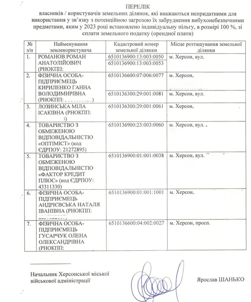 The 100% benefits are related to the fact that the land plots are considered unsuitable for use due to the threat of contamination by explosive ordnance. All of them are located within Kherson.