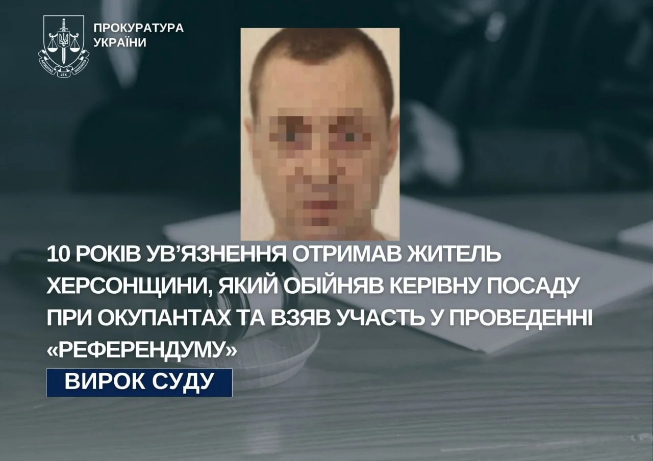 The court convicted a 49-year-old resident of the Kherson region who took a leadership position in the occupation administration and organized the holding of an illegal “referendum” on the region’s accession to Russia. The man was sentenced to 10 years in prison with confiscation of property. In addition, he was deprived of the right to hold positions in the civil service and in local self-government bodies for 14 years, as well as to take part in electoral processes.