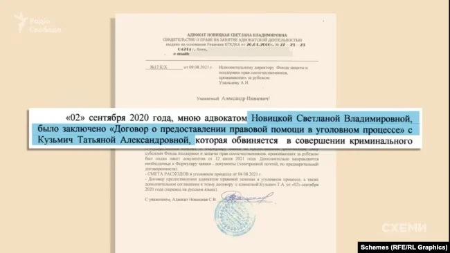The leak contains Novytska’s budget estimate for defending the treason-accused Kuzmich. The cost of legal services is 140 thousand US dollars, at five thousand dollars per month from 2020 to 2022.