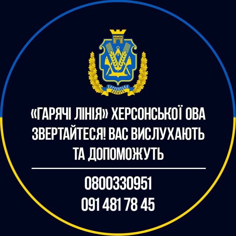 - Телефони «Гарячої лінії» Херсонської ОВА: 0800330951 або 091 481 78 45;