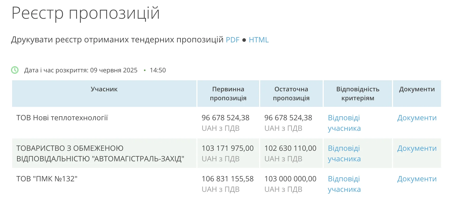 Наразі розглядається пропозиція іншого учасника – ТОВ “Автомагістраль-Захід”, яке пропонує виконати роботи за 102,6 млн грн.