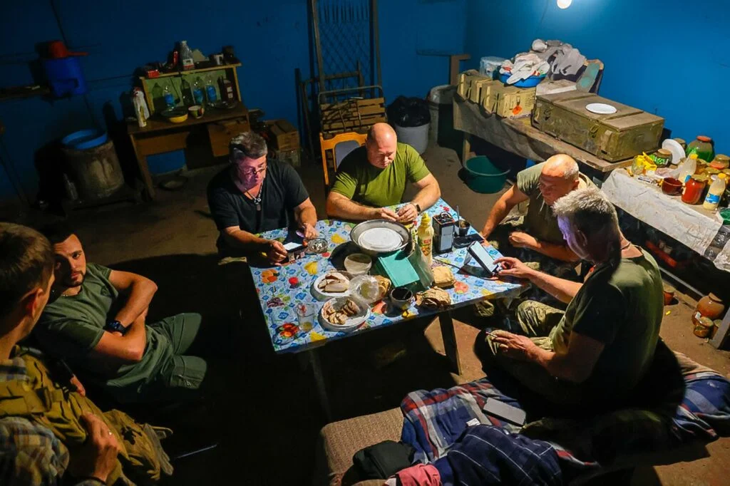 Спускаємося в укриття, де йде некваплива бесіда, хтось вже нарізав сала, солдати пʼють каву.