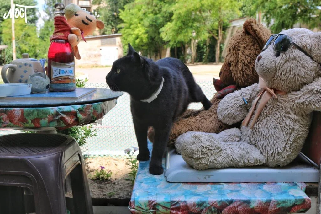 Ще один кіт – вуличний, який став для цього двору своїм, – постійно чергує на арт-об’єкті, можна сказати, охороняє його. Коли Олексій зробив там невеличкий ставок і випустив туди рибок, кіт вирішив, що то – його гонорар, і… Тепер, чоловік думає, що робити, бо порожній ставочок виглядає не так красиво, як з рибками. Але користі від кота все ж більше, ніж прикрощів.