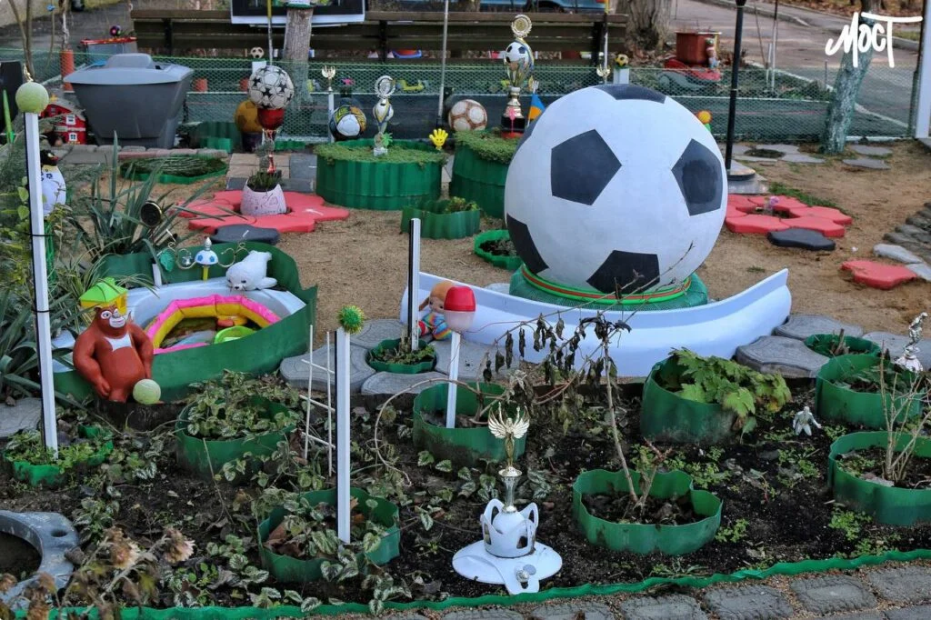 Два роки тому Олексій Борщенко вирішив прикрасити двір свого будинку деякими з спортивних нагород, які зберігаються у нього вдома. Поступово біля вікон своєї квартири зробив невеличкий арт-об’єкт: прикрасив територію спортивними трофеями, декоративними рослинами, зробив з тротуарної плитки доріжки, щоб можна було усе це доглядати.