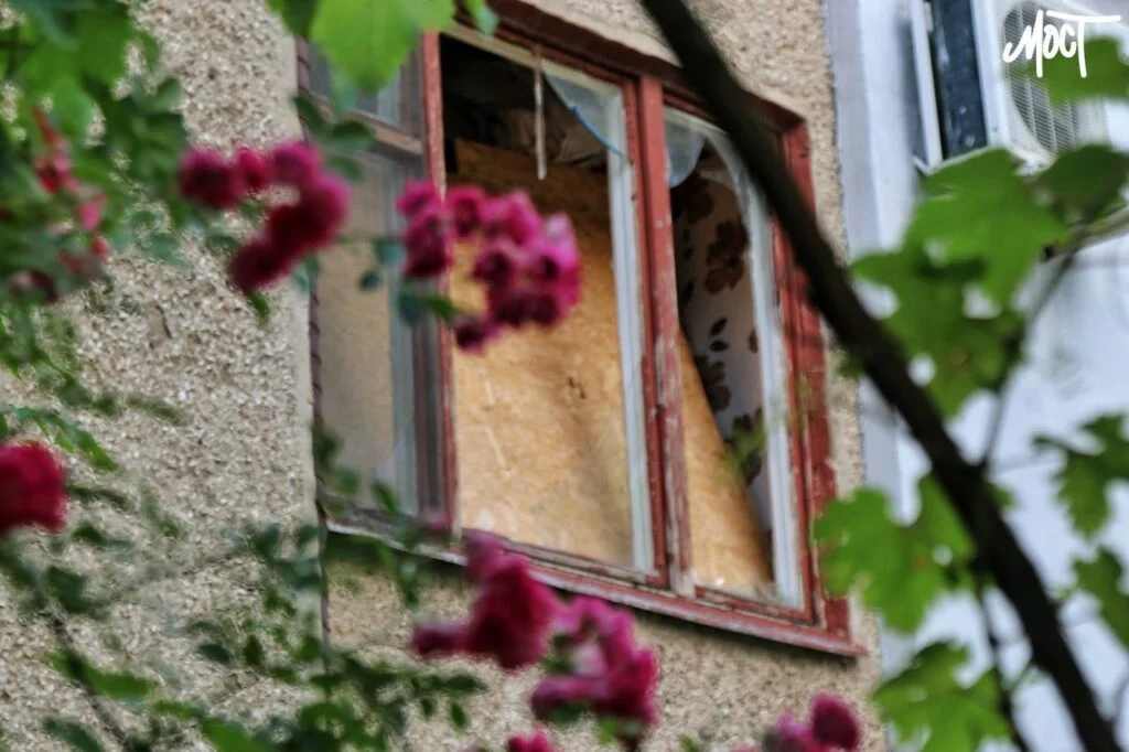 Це – двір звичайного херсонського багатоквартирного будинку – з наслідками російських обстрілів та дронових атак. На стінах – пошкодження від уламків, у деяких вікнах замість скла – OSB-плити. Деякі балконі захищені сітками від FPV-дронів. І тільки прибудинкова територія – не така, як зазвичай в Херсоні.