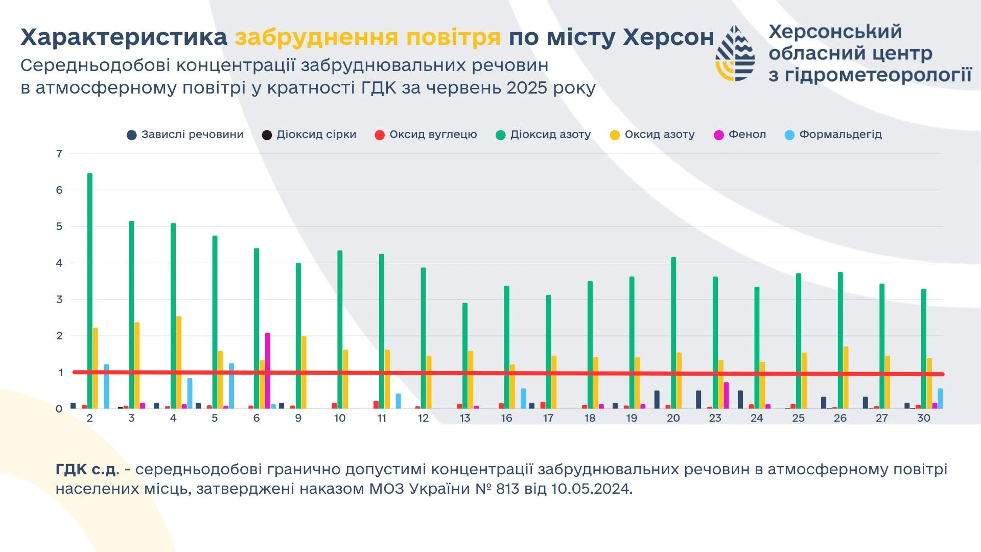 У червні спеціалісти Херсонського центру гідрометеорології зафіксували у повітрі перевищені норми деяких шкідливих речовин.