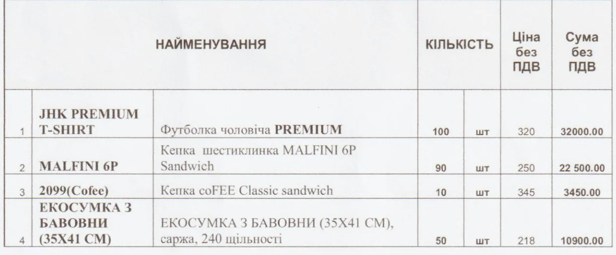 Цього разу у нього замовили 100 чоловічих футболок за ціною 320 грн/шт, 100 кепок та 50 бавовняних екосумок на загальну суму 68 850 грн.