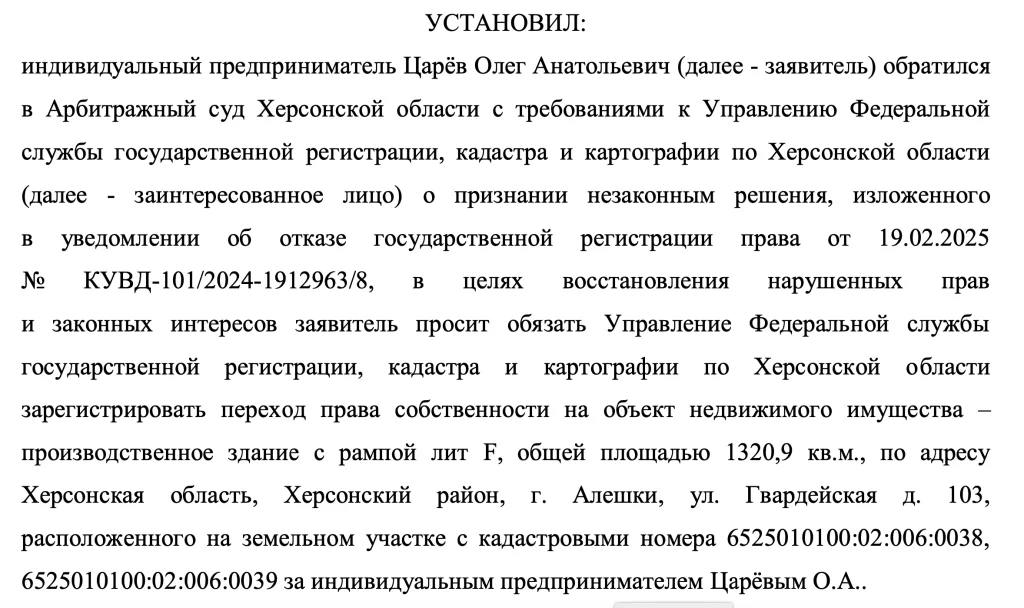 Мова йде про нерухоме майно – виробничу будівлю з рампою літ F, загальною площею 1320,9 кв.м., за адресою Херсонська область, Херсонський район, м. Олешки, вул. Гвардійська б. 103. Окрім того, Царьов хотів зареєструвати на себе земельні ділянки з кадастровими номерами 6525010100:02:006:0038, 6525010100:02:006:0039, на яких і розміщено цю виробничу базу.