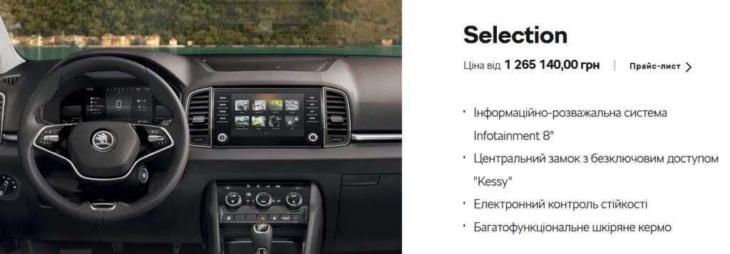 На сайті українського представництва Skoda ціна на зазначену модель Selection складає 1 мільйон 265 тисяч 131 гривня.