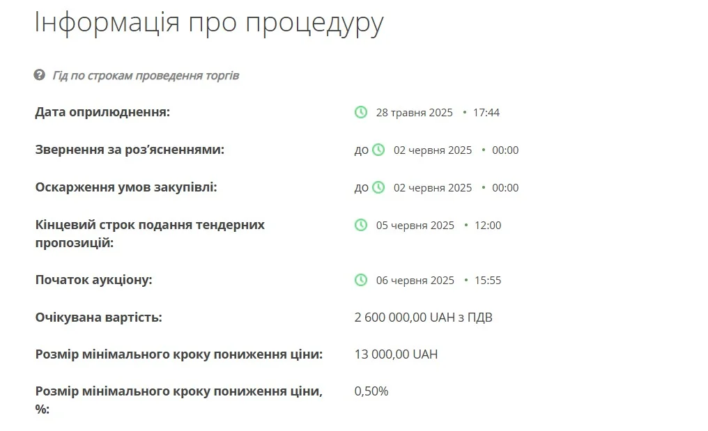 Наразі триває процес подання заявок. Аукціон розпочнеться 6 червня. Зазначена очікувана вартість – 2,6 мільйони гривень з ПДВ.