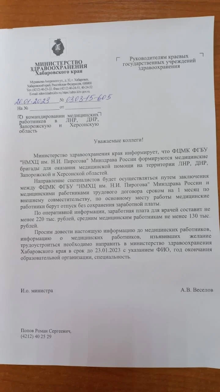 Хабаровським та томським лікарям пропонують відрядження у так звані «Л/ДНР», а також у Запорізьку та Херсонську області за «великі» гроші.