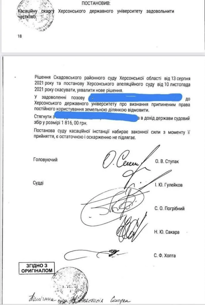 «Мова йде про скасування рішень судів першої і другої інстанції, які визнали право власності за громадянином М. на земельні ділянки площею 0,7 га. Ця історія триває вже понад 10 років, але ми наполегливо працювали над тим, щоб довести незаконність дій Лазурненської селищної ради, власника будиночків щодо відчуження земельних ділянок без згоди університету та Міністерства освіти і науки України. Зараз маємо остаточне рішення!», – наголосив Олександр Співаковський.