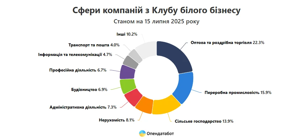Найбільше учасників Клубу працюють у сфері торгівлі, далі — переробна промисловість, сільське, лісове і рибне господарство, сфера нерухомості та адміністративне обслуговування.