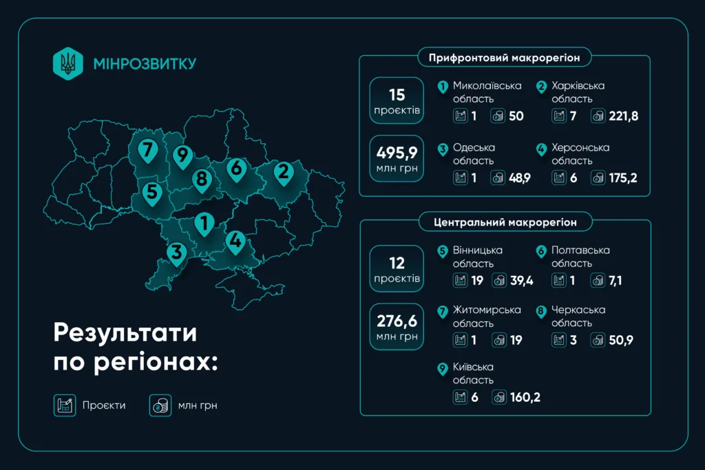 За результатами відбору проєктів, найбільші обсяги фінансування отримають Харківська, Херсонська, Київська та Львівська області.