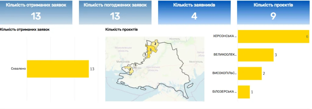 Відповідно до даних платформи DREAM на Херсонщині заявки схвалені для Великоолександрівської, Високопільської та Білозерської громад.