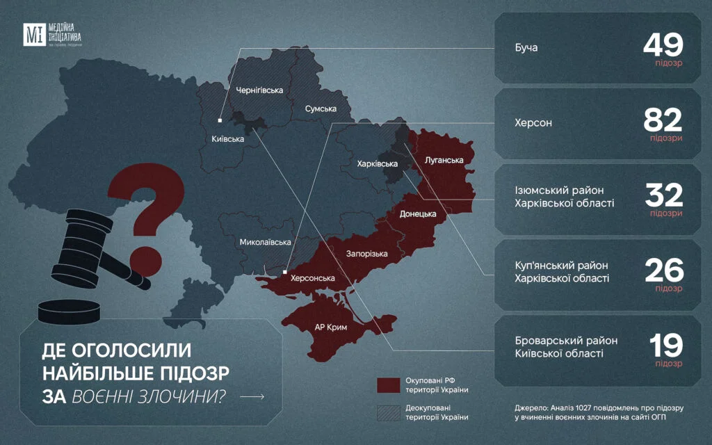 За кількістю підозр серед окремих населених пунктів Херсон посів перше місце — 82 повідомлення. Для порівняння, у Бучі зафіксували 49 підозр, в Ізюмському районі Харківської області — 32, у Куп’янському — 26.