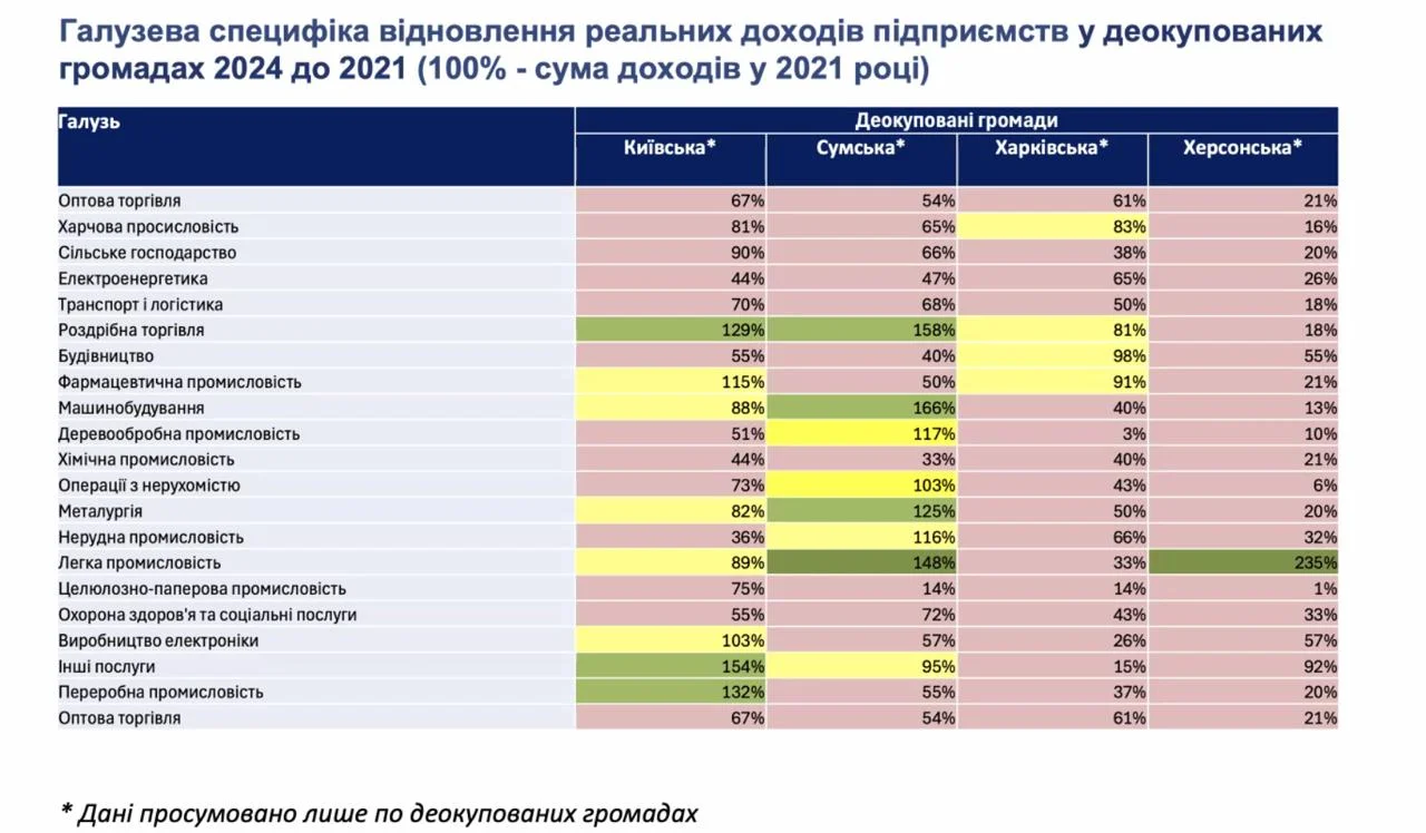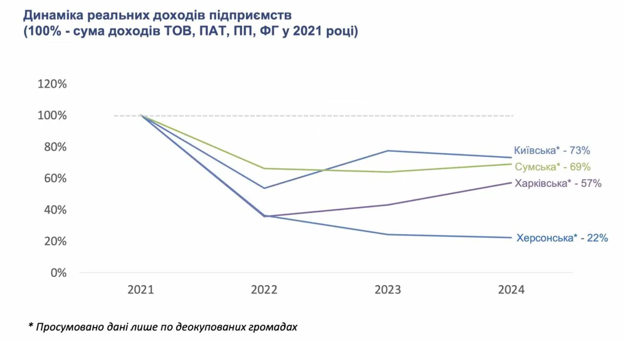 Аналіз динаміки реальних доходів підприємств у Київській, Сумській, Харківській та Херсонській областях демонструє, що Херсонщина значно відстає від інших регіонів. Якщо Київська область вже досягла 73% довоєнного рівня доходів, Сумська – 69%, а Харківська – 57%, то Херсонщина залишається вкрай низькому показнику.