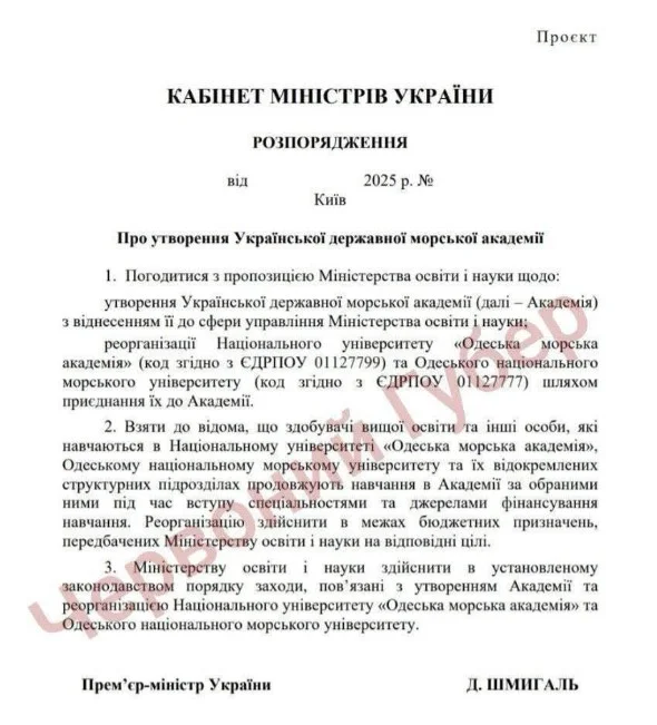 У документі зазначено, що новий навчальний заклад виникне шляхом реорганізації та об’єднання Одеської морської академії й Одеського національного морського університету.