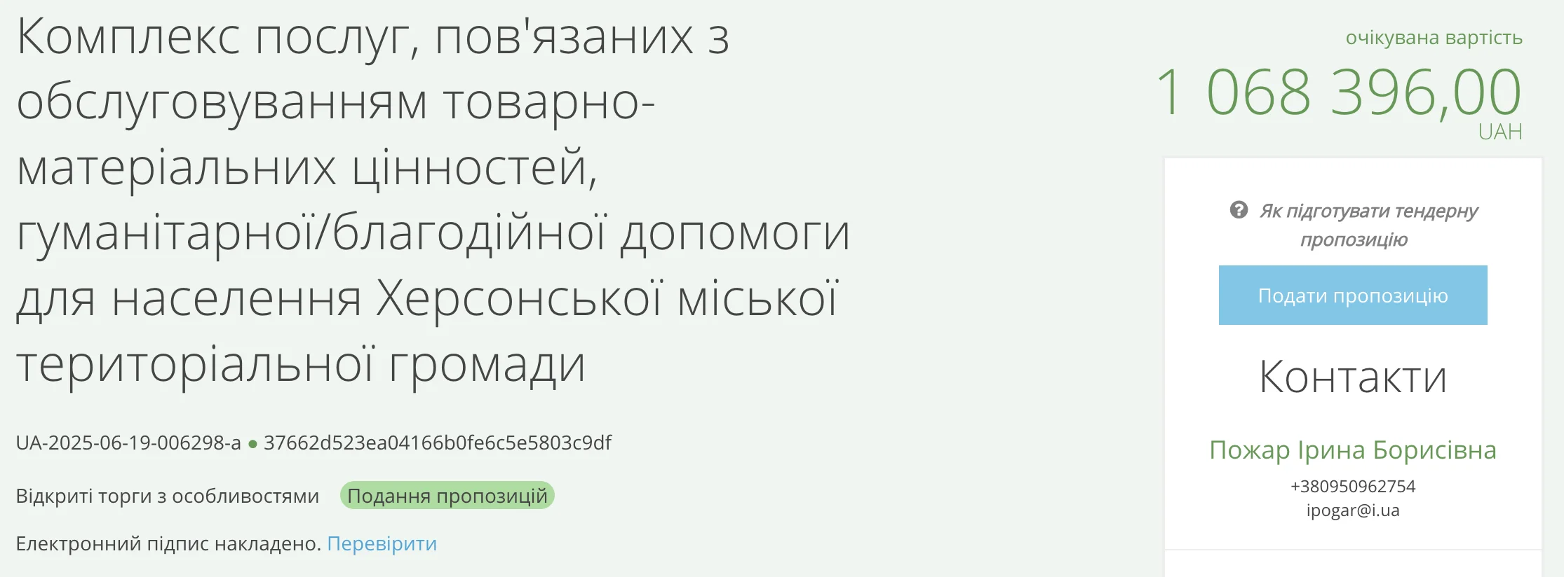 Херсонська міська військова адміністрація планує витратити на вантажні послуги та послуги зберігання гуманітарної допомоги 1 068 396 гривень.