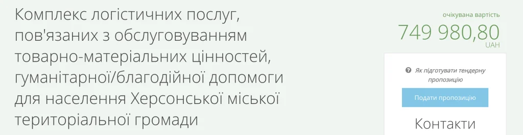 Херсонська міська військова адміністрація планує витратити на доставку, вивантаження та зберігання гуманітарної допомоги, яка призначена для населення Херсонської громади, 749 980 гривень.