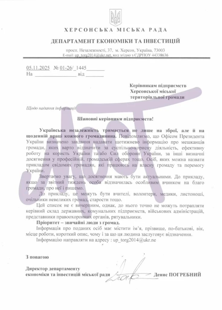 Завдання на збір даних надійшло херсонським посадовцям з Офісу Президента. Інформацію Погрібний має відправляти в Офіс щотижнево.