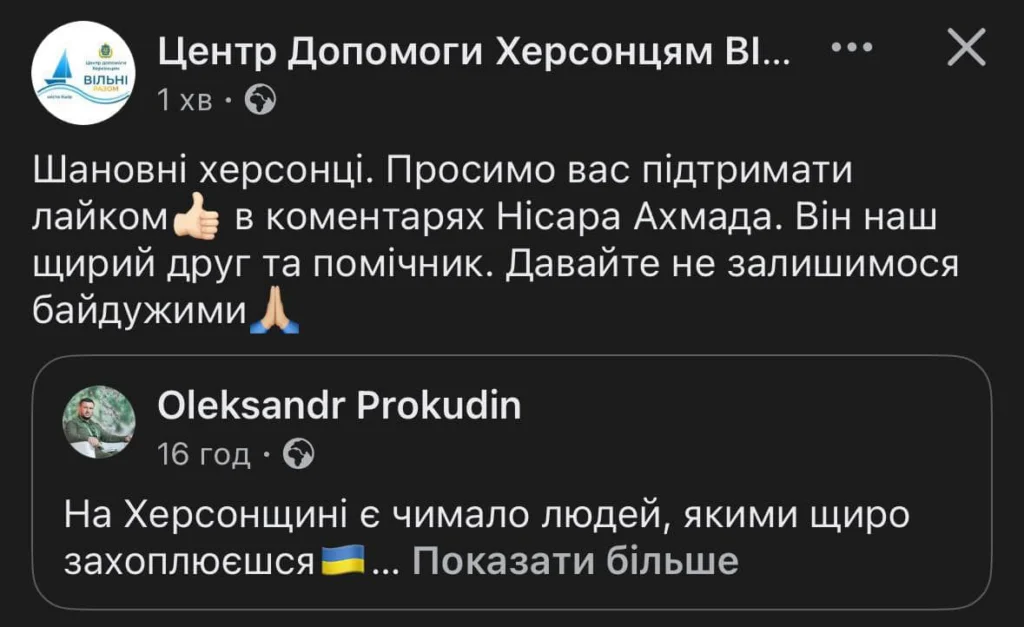 Так, агітувала підтримати депутата Ахмада сторінка “Центр допомоги херсонцям Вільні разом”.
