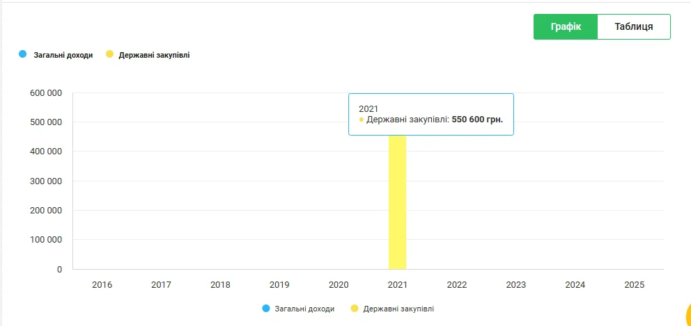 Компанія брала участь у держзакупівлях лише один раз — у 2021 році на суму 550 600 грн.
