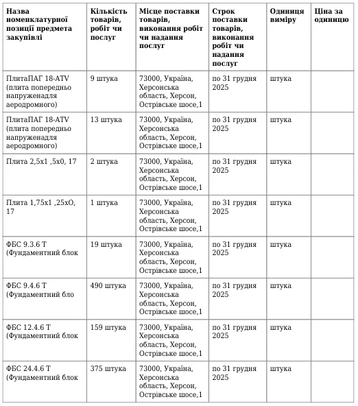 Підприємство закупило понад 500 бетонних фундаментних блоків різних типів, а також кілька десятків великих залізобетонних плит. Серед них — плити для облаштування основи та перекриття, а також блоки, які зазвичай використовують для зведення стін та опорних конструкцій.