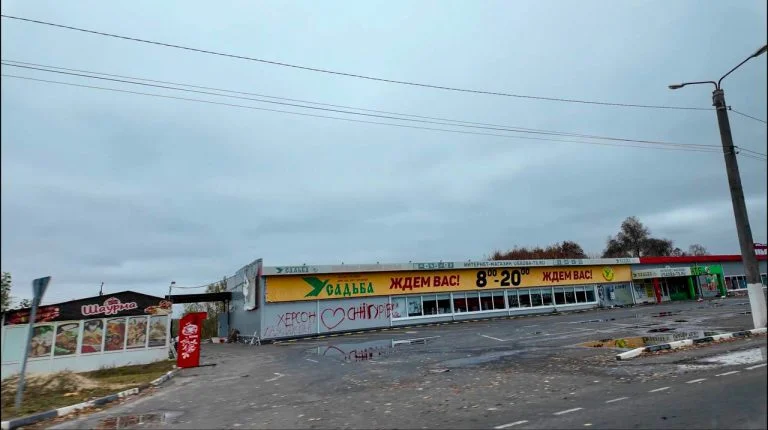 В мережі з’явився кадр, на якому можна побачити магазин в місті Суджа із зробленим кимось написом «Херсон» на фасаді. Також поруч хтось написав «Снігурівка».
