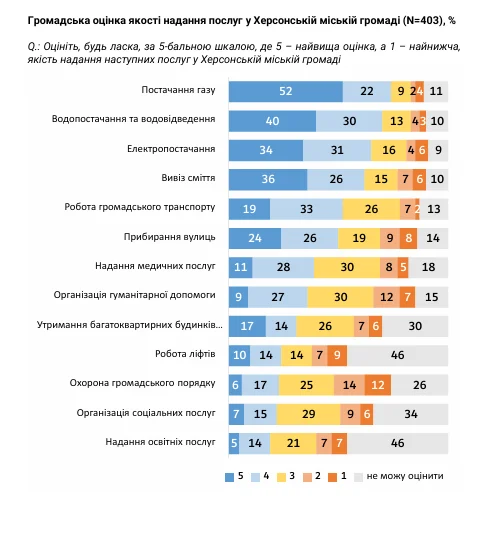 Серед послуг із низькими оцінками опитані назвали роботу громадського транспорту та вивіз сміття, а найгірше оцінили утримання ліфтів і прибирання вулиць. Також серед послуг із низьким рейтингом були організація гуманітарної допомоги та охорона громадського порядку.