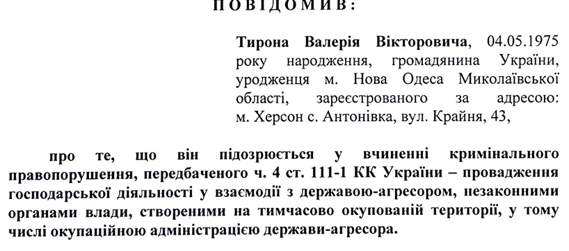 Херсонця Валерія Тирона підозрюють у колабораційній діяльності, пособництві РФ та веденні незаконної підприємницької діяльності.