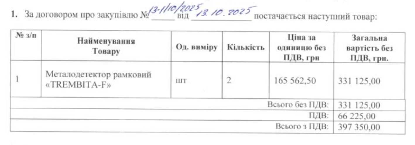 Згідно з контрактом, фірма має поставити два металодетектори ‘TREMBITA-F”, вартістю 165,5 тис. грн/шт.
