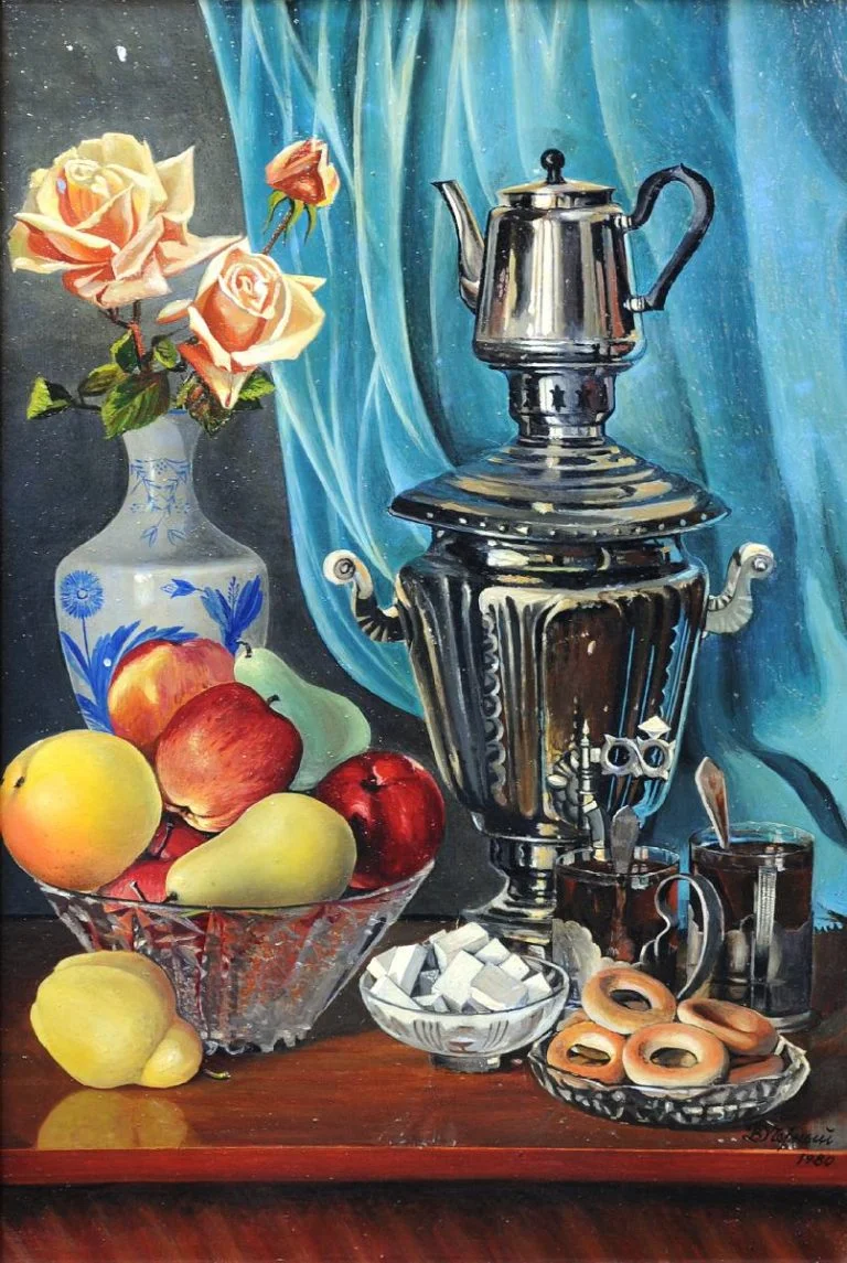 Було ідентифіковано наступні картини: Василь Чорний “Натюрморт з самоваром”, Георгій Курнаков “Бузок на вікні”, Людмила Петрова “Радість”, панно “Давай, милка, постраждаймо” та “Модниці”.