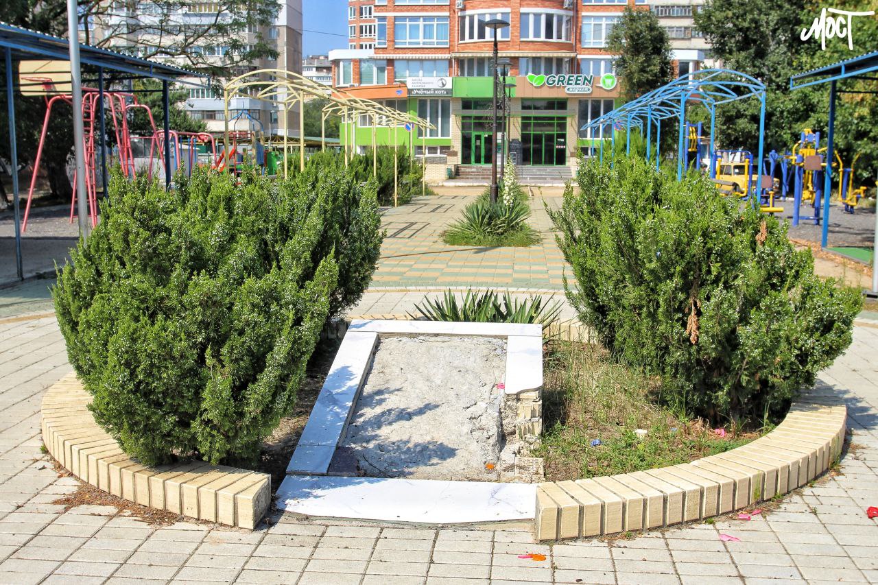 Ще один слід окупації, який відобразився на цьому маленькому сквері — це розбита пам’ятна плита на честь Руслана Сторчеуса.