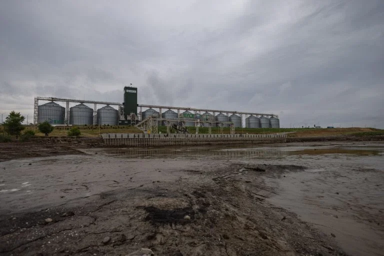 Зерновий термінал знаходить на березі Каховського водосховища, яке зараз, внаслідок підриву російськими окупантами дамби Каховської ГЕС, перетворюється на пустелю.