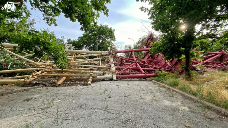 Через 8 місяців після деокупації Херсона на території парку “Херсонська фортеця”, що на вулиці Перекопська, й досі лежить понівечена підривом телевежа.