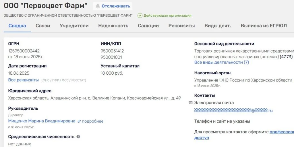 Нелегальний заклад займатиметься роздрібною торгівлею лікарськими засобами. 38-річна Марина Міщенко зазначена як ймовірна засновниця і директорка компанії.
