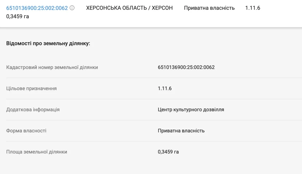 По справі відомо не багато. 28 серпня 2021 року до Херсонського райвідділку поліції надійшло повідомлення з виконавчого комітету Херсонської міської ради про те, що 26 серпня 2021 року невстановленою особою було підроблено відомості щодо земельної ділянки з кадастровим номером 6510136900:25:002:0062 та внесені до Державного земельного кадастру як «02.10 Для будівництва і обслуговування багатоквартирного житлового будинку з об`єктами торгово-розважальної та ринкової інфраструктури».