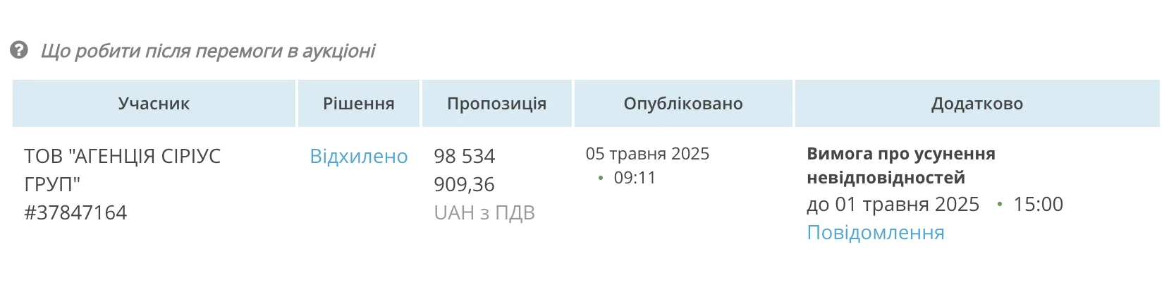 Уповноважена особа розглянула пропозицію учасника та відхилила її. Як зазначено у протоколі відхилення, компанія не надала копії сертифікатів, які підтверджують, що обладнання для будівництва відповідає стандартам. На виправлення недоліків фірмі дали 24 години, але компанія їх не усунула.