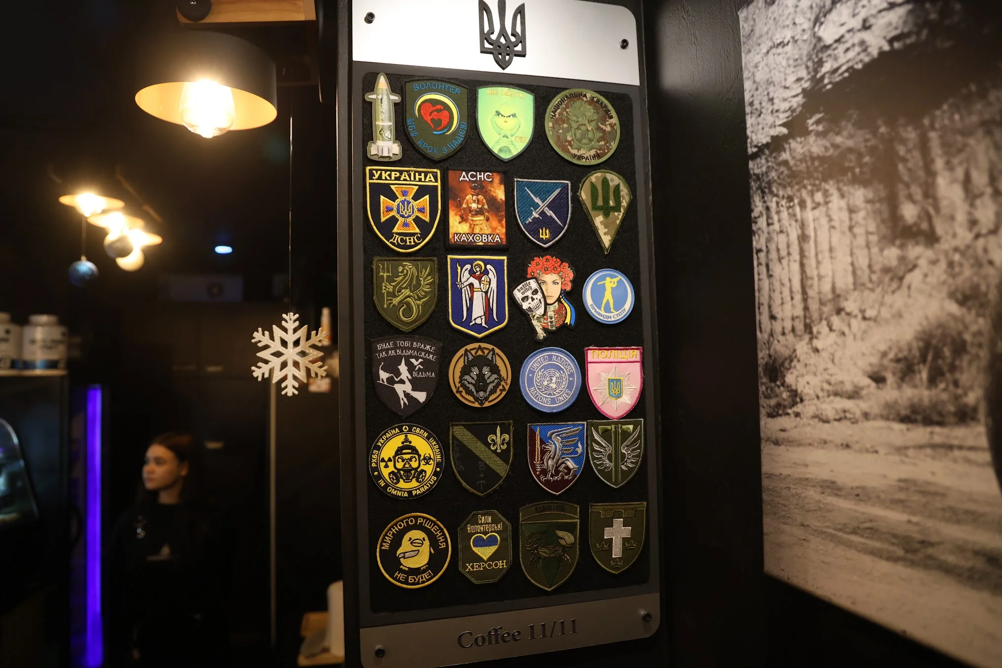 Особливе місце в кав’ярні “11/11” відведене для шевронів. Тут є спеціальна дошка, на якій є патчі та шеврони різних бригад, бійці яких були відвідувачами закладу. За словами Олексія, перші шеврони залишили хлопці, які визволяли місто. І зараз, заходячи на каву, військовослужбовці підтримують цю традицію.