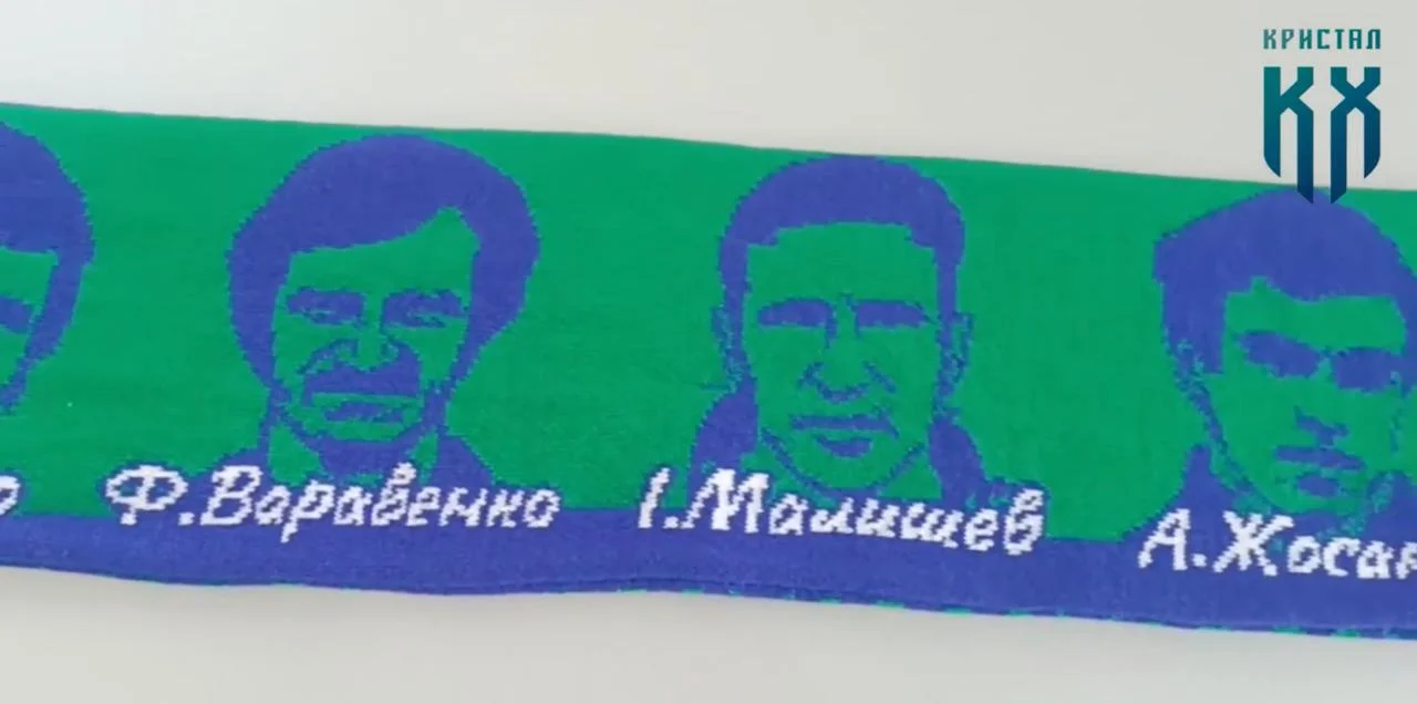 На одній стороні шарфа зображено сім постатей, які у різні роки зробили вагомий внесок у розвиток «Кристала». Інша сторона прикрашена орнаментом у стилі української вишиванки та назвою клубу.