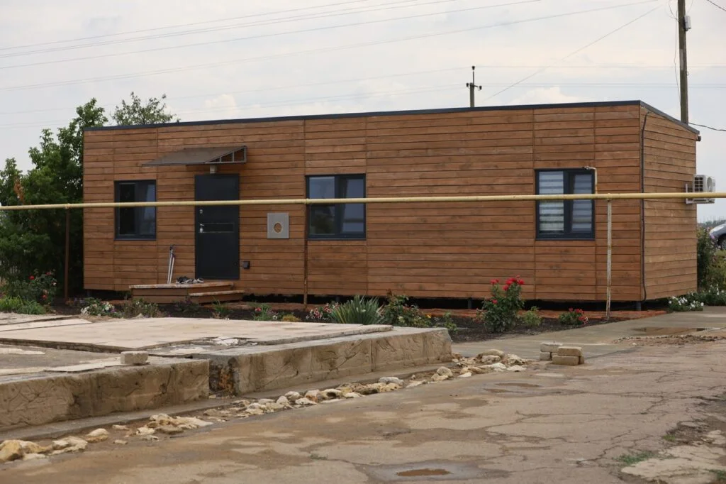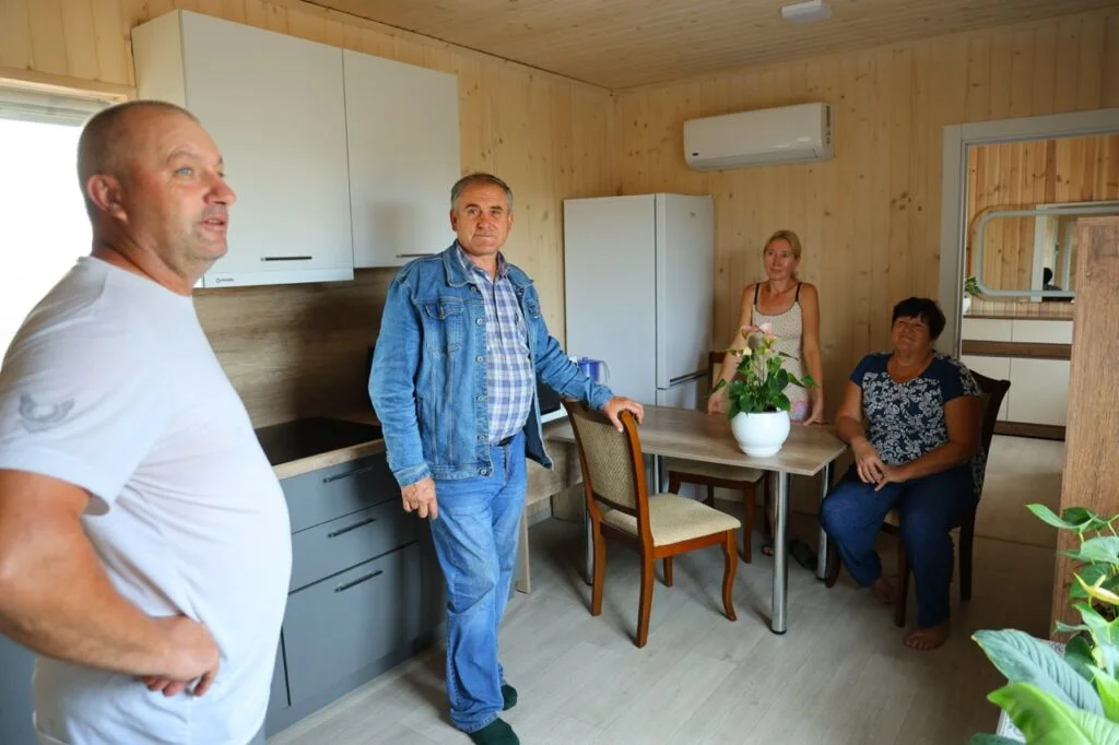Начальник військової адміністрації Костянтин Стародумов пізніше нам пояснив, що це не тимчасові намети, які благодійні організації надавали на початку відновлення, а повноцінні будинки з технікою і меблями, розраховані щонайменше на 50 років експлуатації.