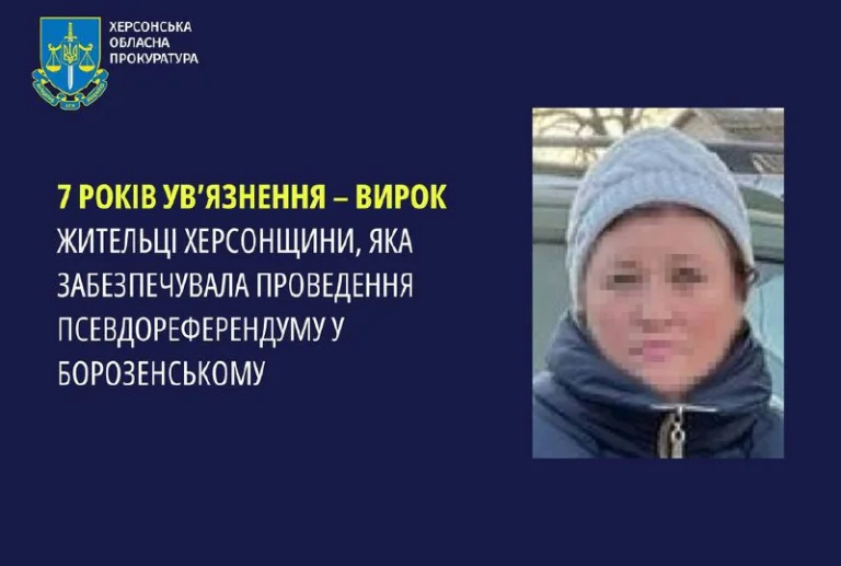 Мешканка села Борозенське Бериславського району Херсонської області, яка допомагала незаконній владі проводити псевдореферендум отримала 7 років в’язниці з конфіскацією майна.