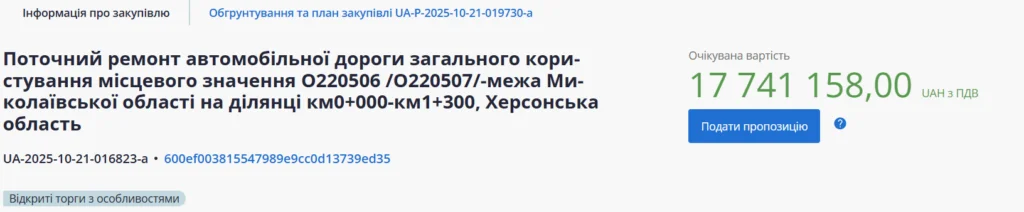 Державна установа “Місцеві дороги Херсонщини” оголосила тендер на поточний ремонт автомобільної дороги загального користування, що межує з Миколаївською областю.